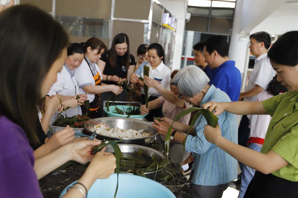 许多同学是第一次动手包粽子,校关工委王福安老师、刘菊芳老师现场教学,折粽叶、放糯米、放粽馅、裹叶子、绑粽线,经过两位老师的耐心指导及经验积累后,同学们包出的粽子突显出了棱角,一个个漂亮的粽子便在手中成型。