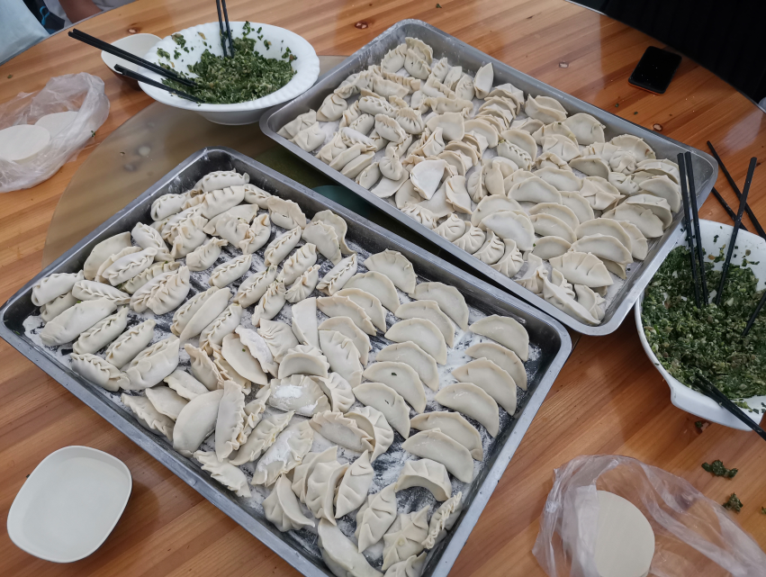 为了让同学们品尝到自己亲手包的粽子和饺子,食堂工作人员现场蒸煮。一盘盘热气腾腾的饺子端了上来,刘书记和同学们围坐在一起,边吃边聊,一顿饺子吃得简单但热乎。