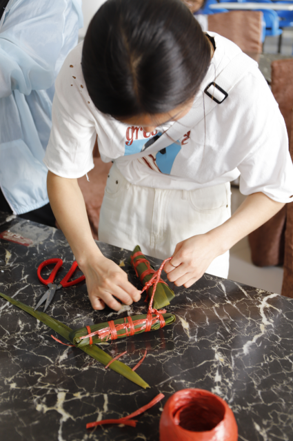 活动伊始,只觉粽叶清香萦绕,雪白的糯米、碧绿的粽叶、甜糯的红豆整齐摆放在桌上,少数民族同学们围在一起,热热闹闹地裹着粽子、包着饺子,现场洋溢着一片欢声笑语。