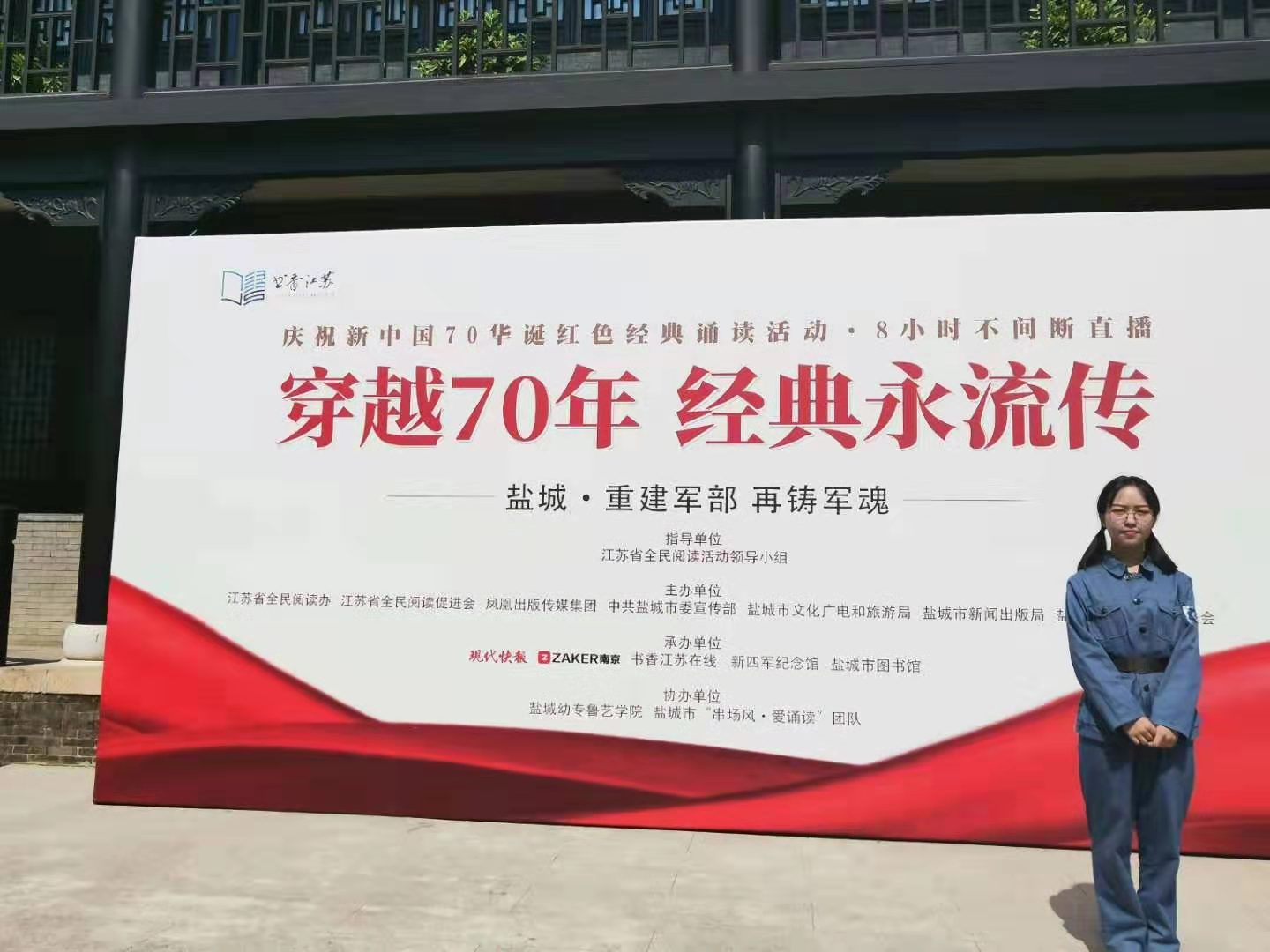 直播在同学们嘹亮的军歌声中走向尾声,我院学生陈佳鑫在采访时说,“盐城是铁军之城,今天听了红色诵读,我感触非常深。作为当代大学生,我们应该发扬铁军精神,好好学习,将来为社会多做贡献。”