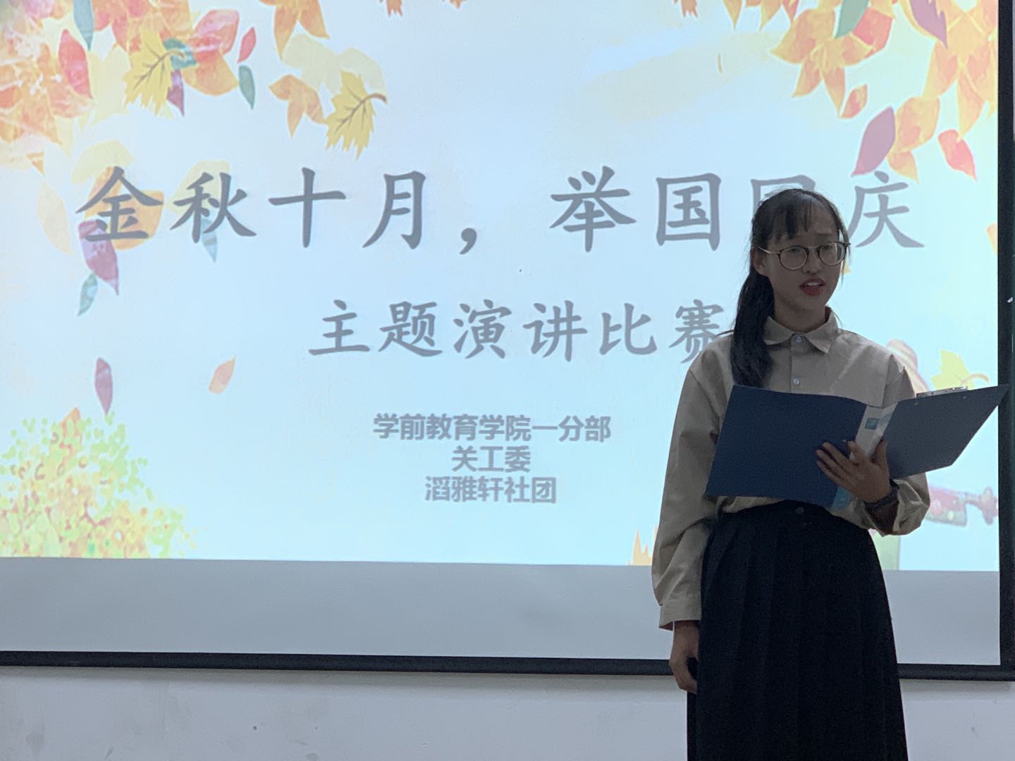 为使我院学子进一步增强责任感与使命感,坚定理想信念,强化爱国之志,10月17日晚,学前教育学院一分部滔雅轩演讲社在艺术楼6100教室举办了“金秋十月,举国同庆”主题演讲比赛。校关工委常务副主任孟金保、院党总支副书记、副院长张子丽、院团总支书记、学工办主任陈兰、陆辉老师、自律会主席李建阳同学、社团联合会主席王晓宇同学担任比赛评委,陈睿涵同学主持比赛。
