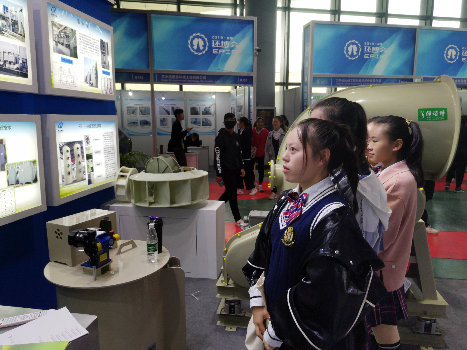 同学们走进环保产业会展交易中心主馆,参观了环保高端装备展览。本届博览会分为水处理、大气治理、综合环境治理、农村环境治理4个主题展区,同学们在各展区认真观看了最新科技成果展示,不时与现场工作人员互动交流。一边观展,同学们还一边参与小游戏,通过微信扫一扫二维码,回答垃圾分类知识问答,了解更多环保知识。