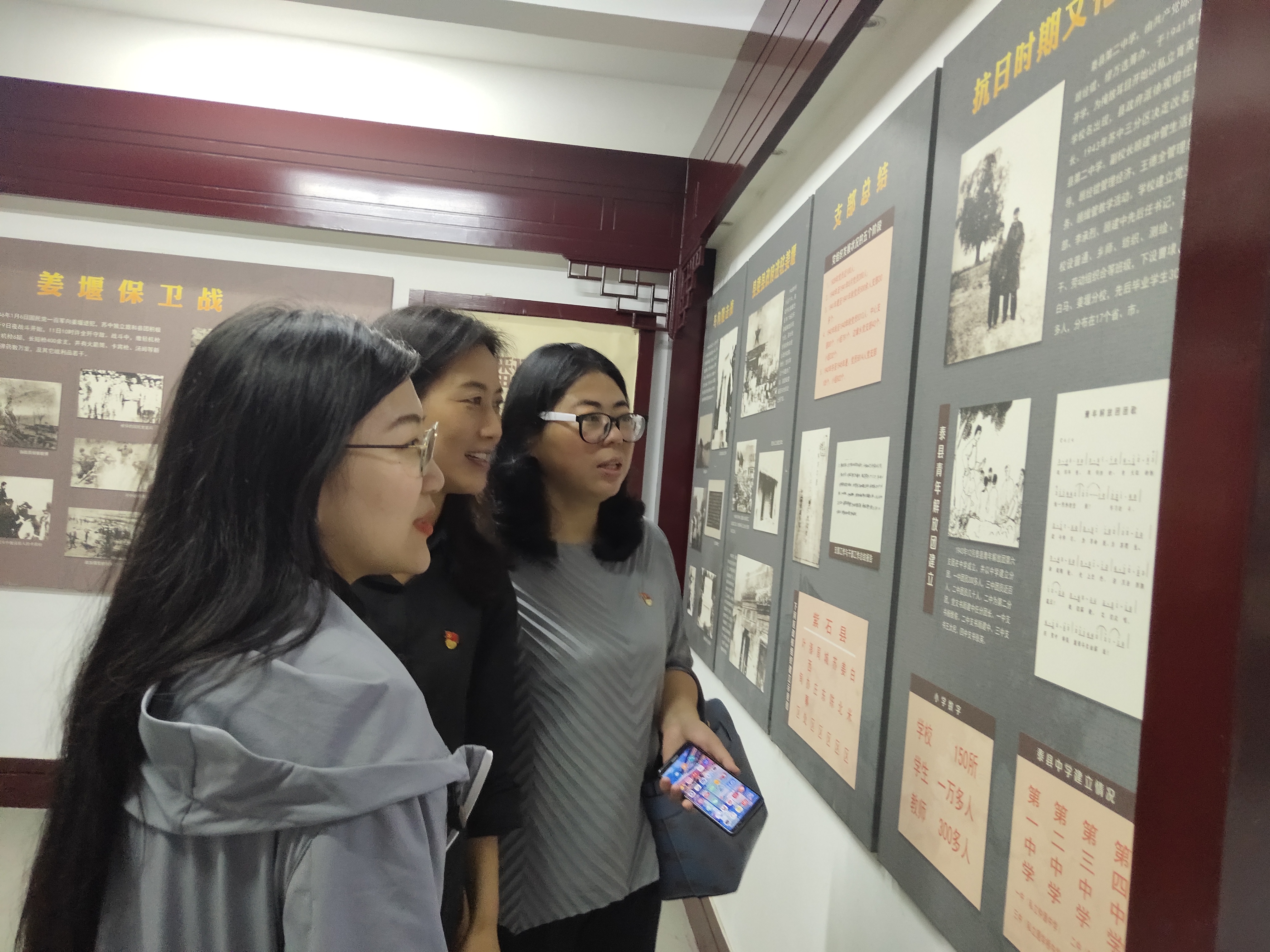 在新四军苏北指挥部旧址——曲江楼,党员们通过生动的照片、史料、实物了解了当年新四军东进等一系列反映泰州人民革命斗争的历史。站立二楼展示大厅,凝视着陈毅同志塑像,党员们仿佛置身于当年那段峥嵘岁月,耳边回响着当年陈毅提出“击敌、联李、孤韩”的“六字”方针那慷慨激昂的声音,感受到新四军奔赴前线的正义军威。