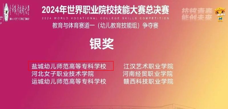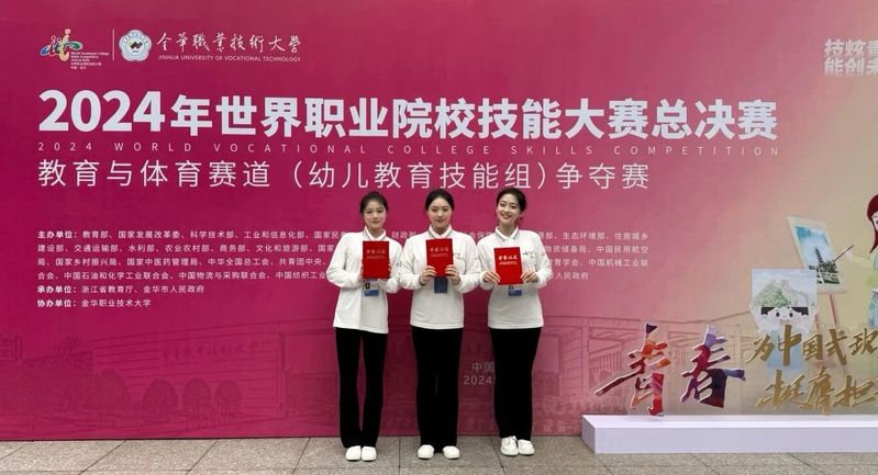 技能超群意气扬,世赛舞台绽光芒!在2024年世界职业院校技能大赛总决赛教育与体育赛道一(幼儿教育技能组)争夺赛中,我校学前教育学院一分院辅导团队代表江苏省与全国61支参赛队同台竞技,取得总分654.28的好成绩(满分700分),荣获该赛道银奖!
