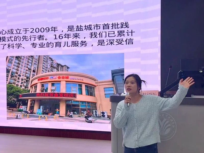 宣讲会上,盐城金宝城赋能成长中心行政主任程燕首先向同学们介绍了赋能中心的地理位置、室内工作环境、特色赋能课程等基本情况。随后,程主任还向同学们分享了赋能中心的教育理念与实践成果,围绕“以爱为基,以专业为纲”的核心育人理念,让同学们深入了解赋能中心的特色与行业前景,同时,她还鼓励同学们怀揣教育热忱,以爱育人深耕有温度的早教托育事业。